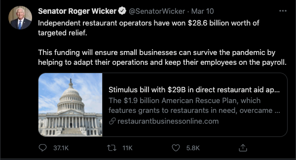 • Sen. Roger Wicker (R-MS): The Restaurant Revitalization Fund was created and funded by the American Rescue Plan.