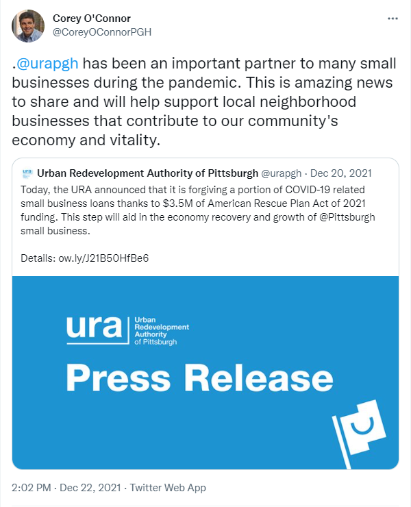 PA: ‘It’s huge’: URA forgives more than $2.9 million in loans awarded to small businesses hit by pandemic. [Pittsburgh Post Gazette, 12/23/2021]
