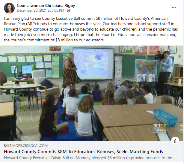 MD: Howard County Commits $8M To Educators’ Bonuses, Seeks Matching Funds. [CBS 13, 12/20/2021]