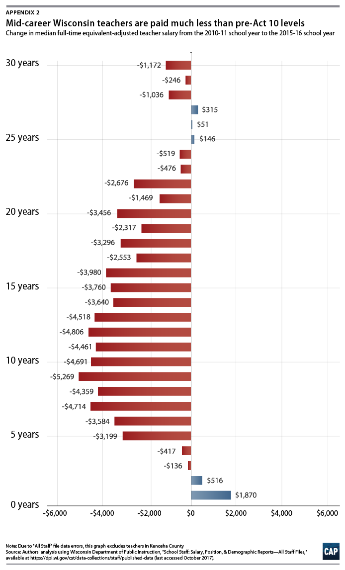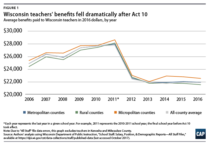 45. To control for potential coding errors in the data, salaries coded as zero and the bottom and top 1 percent of teachers by full-time-equivalent days-adjusted salaries are dropped from the analysis. Additionally, teachers in the Kenosha school district are excluded from analysis of salaries and benefits due to coding errors in the Wisconsin All Staff files in the 2010-2011 school year. Teachers in their first 30 years of experience were included in this analysis.