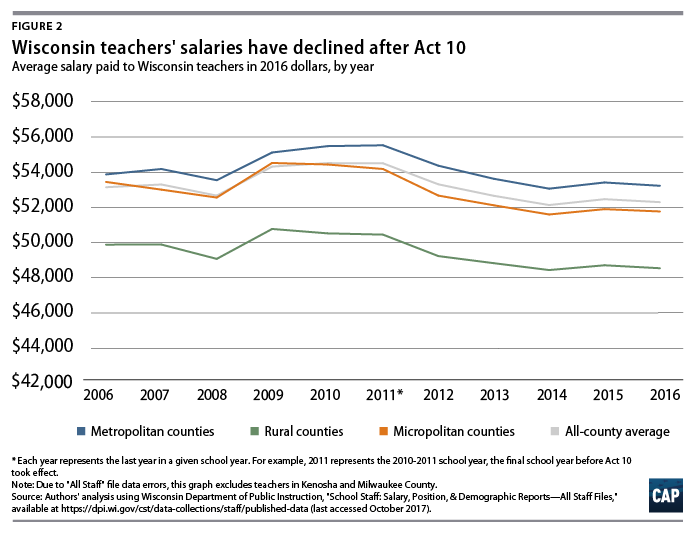 Teacher salaries also fell after Act 10 was passed. Average teacher salaries fell by $1,268 in real terms from the 2010-11 school year to 2011-12 school year. Year-over-year pay cuts were found across urban and rural counties and ranged from 2 percent in metropolitan counties, 3.4 percent in micropolitan counties, and 3 percent in rural counties. On average, inflation-adjusted salaries continued to fall in the years after Act 10 took effect, and remain well below 2011 levels.