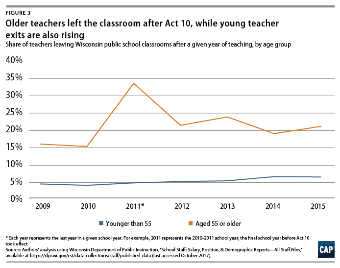 This analysis shows that the percentage of teachers who left the profession after the 2010-11 school year dramatically increased from the share who left after the 2009-10 school year.50 This is unsurprising considering news reports from the aftermath of Act 10, which described many older teachers choosing to retire in order to secure their current retirement benefits.51 The authors’ analysis shows that the immediate uptick in teachers leaving the workforce after the 2010-11 school year was almost entirely driven by teachers over the age of 55, the minimum retirement age with reduced benefits under the Wisconsin Retirement System.52