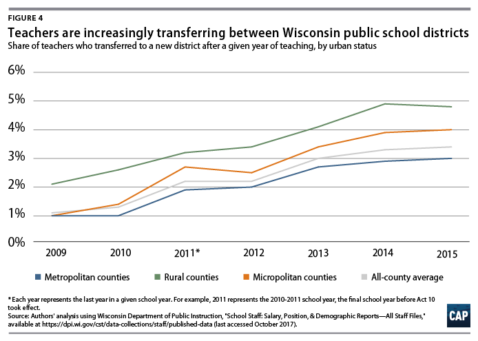 While 1.2 percent of teachers on average left to work at another district after the 2008-09 and 2009-10 school years, this share has risen over time since the passage of Act 10. For example, after the 2014-15 school year, 3.4 percent of teachers moved to another district. This is not a phenomenon limited to metropolitan areas. In fact, teachers in rural counties are most likely to transfer to a different Wisconsin public school district.