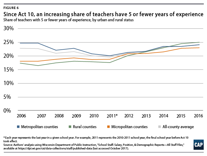 During the school year of Act 10’s passage, 19.6 percent of Wisconsin teachers had five or fewer years of experience, and 7.6 percent had two or fewer years of experience. This has risen in recent years. In the 2015-16 school year, 24.1 percent of teachers had taught for five years or fewer, and 10.3 percent were in their first two years of teaching. Rural districts have seen their share of low-experience teachers grow most dramatically, from 17.6 percent of teachers in the 2010-11 school year to 25 percent in the 2015-16 school year.