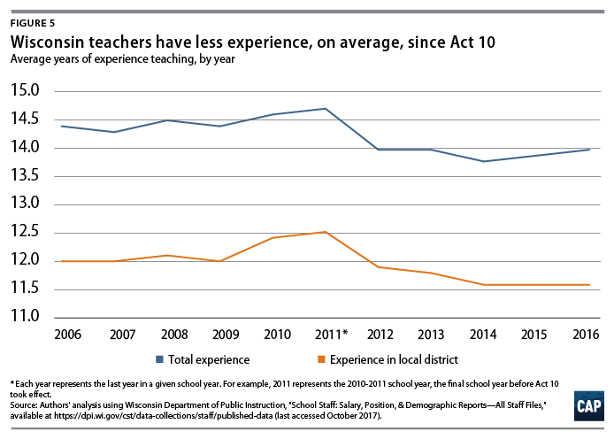 This analysis shows that the average Wisconsin teacher in the 2015-16 school year had 13.9 years of total experience and 11.6 years of experience in their current school district. This is below the peak total experience of 14.6 years and district experience of 12.5 years in the 2010-11 school year.