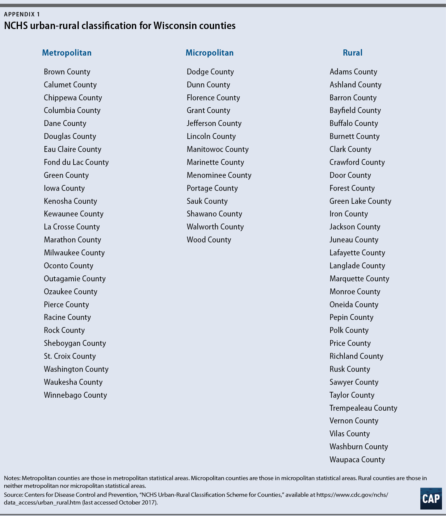 In order to determine if Act 10 affected urban areas of Wisconsin differently than rural areas, the authors’ analysis classifies counties using the 2013 National Center for Health Statistics (NCHS) Urban-Rural Classification Scheme for Counties.39 (see Appendix 1) The NCHS’s four metropolitan classification levels, which include counties within metropolitan statistical areas as defined by the Office of Management and Budget, are combined in this analysis. Micropolitan counties are defined as those within micropolitan areas, which have urban clusters with a population of at least 10,000 but less than 50,000.40 The NCHS defines counties that are in neither a metropolitan nor a micropolitan area as noncore counties, which this analysis labels as rural.41