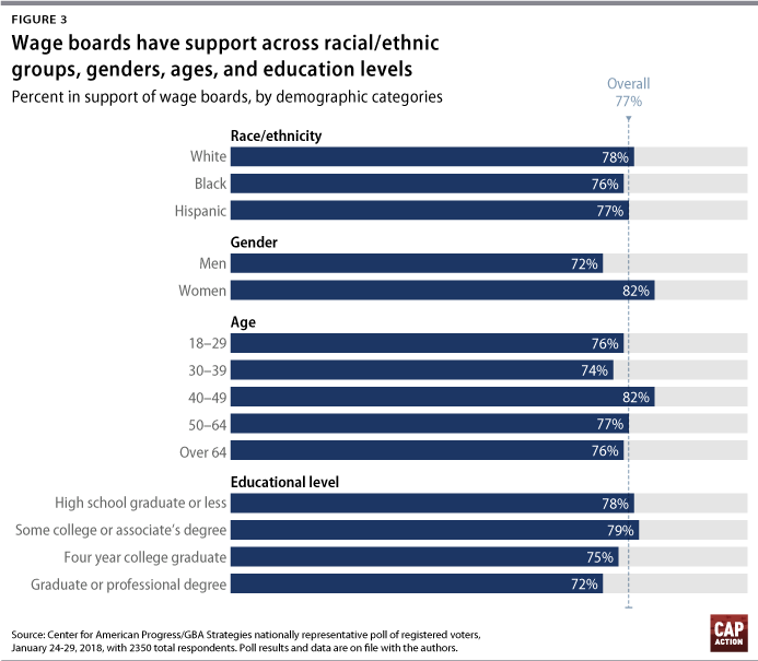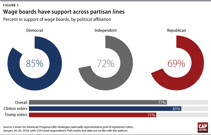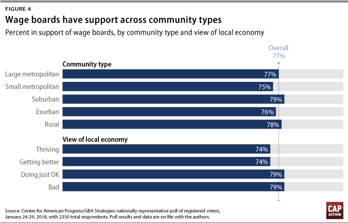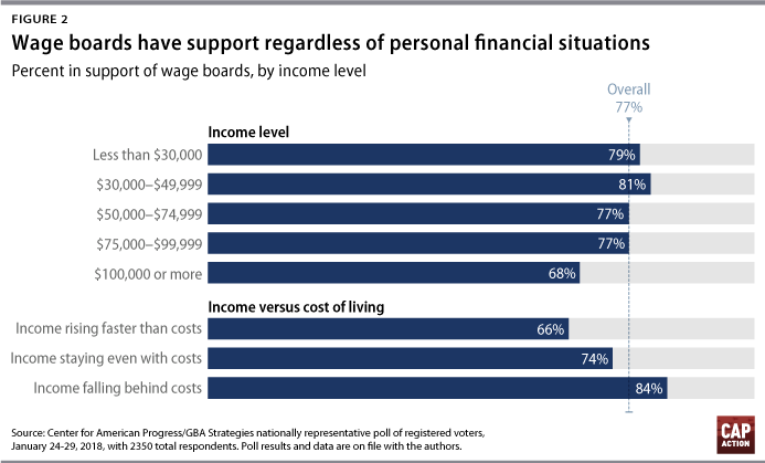 *Author’s note: This poll surveyed 2,350 registered voters from January 24 through 29, 2018. The survey was conducted by GBA Strategies online among respondents drawn from a custom database of more than 6 million Americans recruited online, by phone, and through social media. Results are weighted to reflect national demographic statistics for registered voters. The survey carries a margin of error of 2.2 percentage points at the 95 percent confidence level. The specific poll question asked about support for a policy to “create wage boards that bring together businesses, government, and workers to ensure fair wages for employees across a specific industry and prevent employers from abusing the availability of cheap labor to drive down wages.”