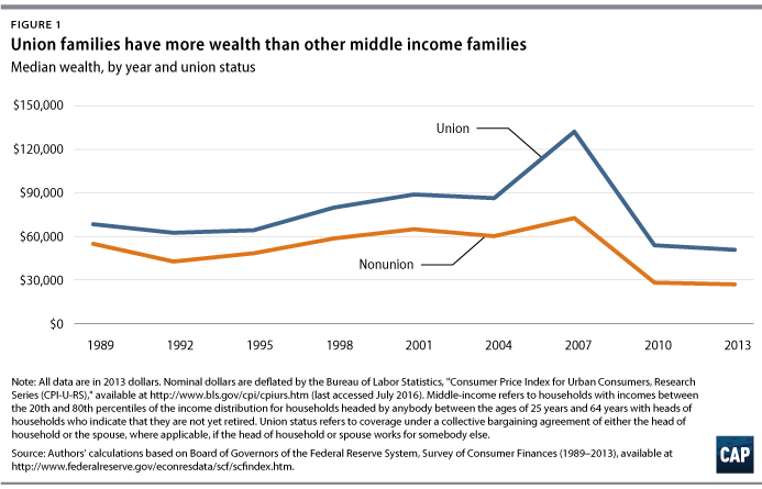 This CAP Action analysis of Federal Reserve Board data, however, connects unions with more wealth among workers. The following data analysis provides some of the first empirical evidence that unions are associated with more wealth and thus more economic security for middle-class Americans. The data strongly suggest that strengthening unions is key to improving Americans’ financial well-being.