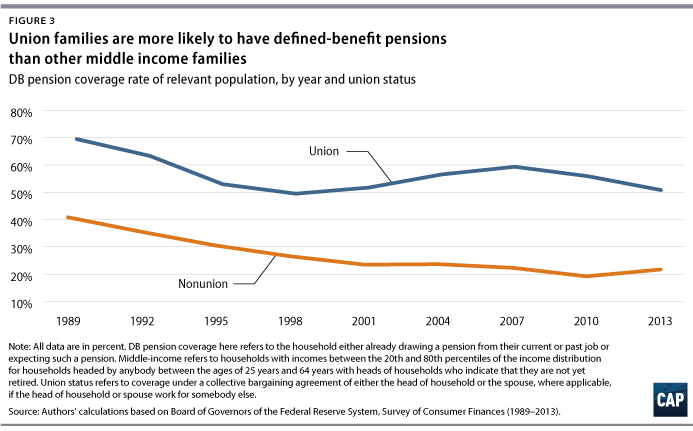 One of the largest—if not the largest—reasons for workers to save is to be able to enjoy a secure retirement that does not require them to choose between necessities, such as heating their homes and paying for their medications. The measure of total wealth used in this analysis only includes marketable wealth and thus actually understates union households’ retirement readiness, as it does not take the value of defined benefit pensions into account. The imputed lump-sum value of DB pensions is not readily available in the Survey of Consumer Finances and is often difficult to calculate. DB pensions guarantee a lifetime stream of income to people once they retire, reducing the necessary amount of other savings that people need to have to maintain their standard of living in retirement. As shown in Figure 3, the data show that union members are much more likely to have a DB pension from a current or previous job; these pensions substantially increase workers’ chances at a secure retirement. In addition to being more likely to have a DB pension, the median union middle-class household held $13,000 (in 2013 dollars) in savings in retirement accounts such as 401(k)s and individual retirement accounts in 2013, or more than three times as much as the median nonunion middle-class household. This means that the typical middle-income union member is better prepared for retirement than the typical nonunion middle-income worker because they have greater retirement savings and are more likely to have a DB pension.