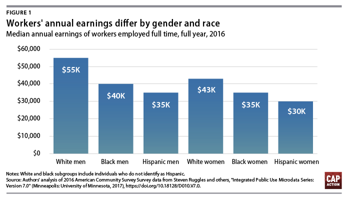 Figure 1 shows the differences in median annual earnings received by full-time workers who work the entire year across race and gender from the 2016 American Community Survey. The typical full-time, full-year white male worker reported earning $55,000. In contrast, typical full-time, full-year white female workers earned $43,000, black women earned $35,000, and Hispanic women earned $30,000. Black men earned $40,000 per year and Hispanic men earned $35,000.