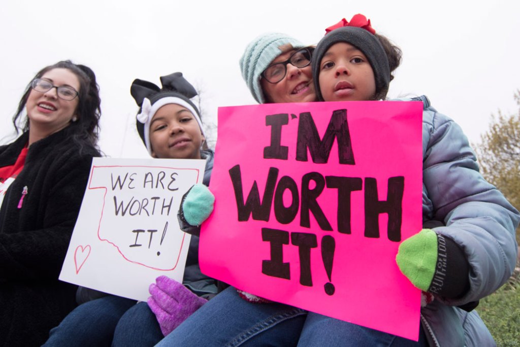A family participates in a rally for higher wages in Oklahoma City, April 2018. (Getty/J Pat Carter)