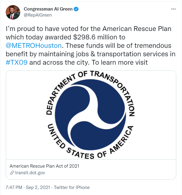 TX: Metro receives $299M in federal COVID aid. [Houston Chronicle, 09/02/2021]