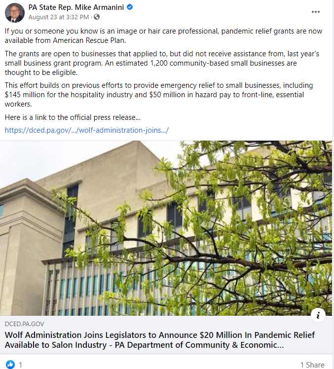 PA: Pa. state lawmakers announce $20 million funding for personal, hair care professionals. [ABC 6, 08/19/2021]