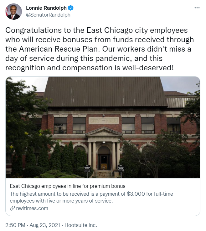 IL: East Chicago employees in line for premium bonus. [NWI, 08/22/2021]