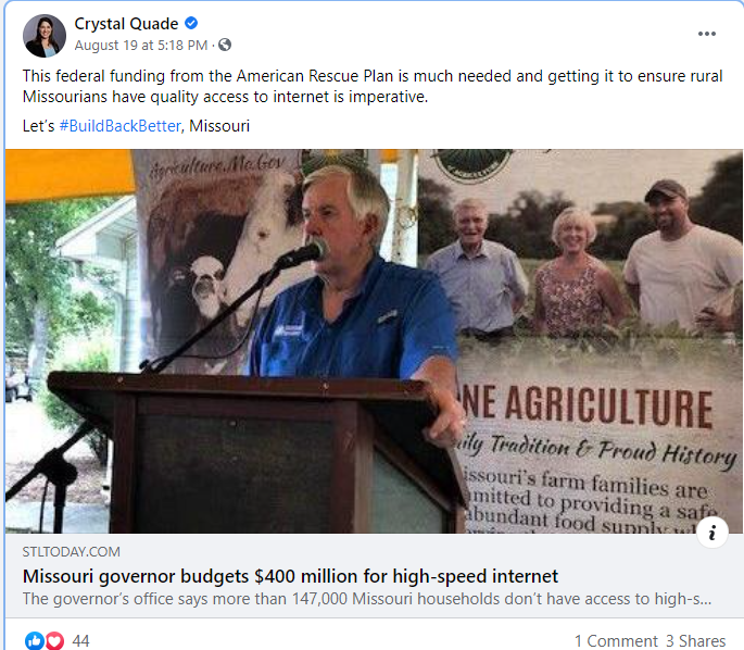 MO: Missouri governor budgets $400 million in federal funds for broadband internet expansion. [Springfield News Leader, 08/21/2021]