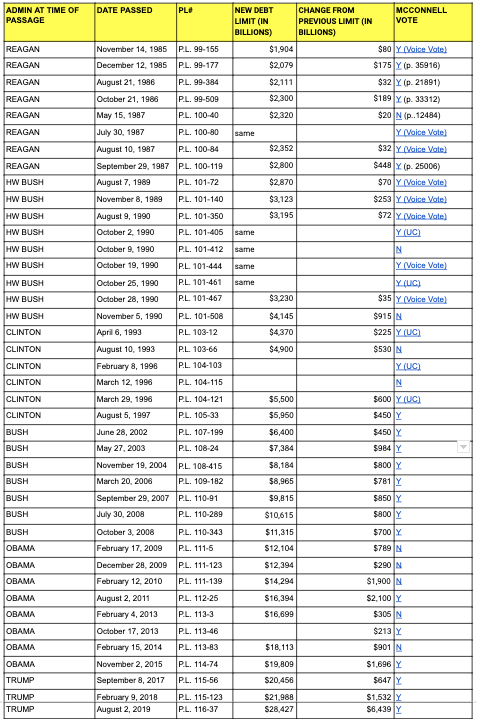 He knew then the Senate had a responsibility to do its job, and urged all Senators to vote for the August 2019 debt limit increase. Only four Democratic Senators voted against the increase, while 24 Republican Senators joined them.