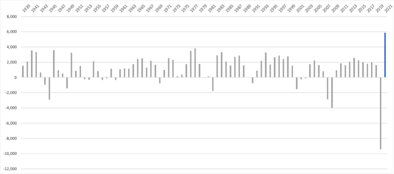 Figure 1: Change in nonfarm employees, January to November 1939–2021, thousands