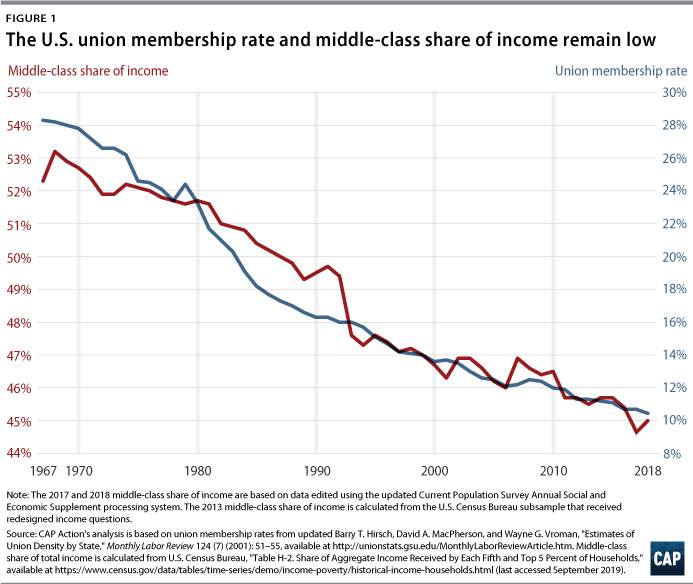 Figure 1 shows this trend. In 1967, when 28.3 percent of American workers belonged to a union, 52.3 percent of national income went to middle-class households. (see Figure 1) But over the past five decades, both those numbers have steadily declined. In 2018, just 10.6 percent of American workers were unionized, a record low, and only 45 percent of income accrued to the middle class—less than in 1967.