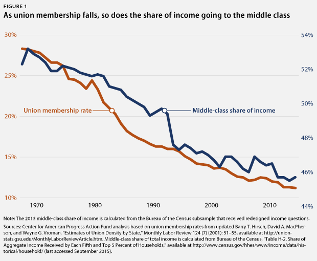 There are certainly many forces driving U.S. income inequality and the reduction in the middle-class share of income. Increasing globalization, new forms of technology, and other policy choices have a role to play. But it is critical to consider the importance of dwindling union membership rates. A variety of economic studies, including a recent study from economists at the International Monetary Fund, have found that rising income inequality is in part explained by deunionization.
