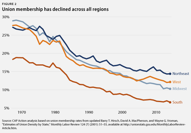 The correlation between the declining middle-class income share and unionization rates is made clear in Figure 1. As the share of workers who are union members has dramatically fallen over recent decades, the share of income going to the middle class has contracted. While nearly 3 in 10 workers were unionized in 1967, the union membership rate has dropped by more than 60 percent over the past 47 years. And while today’s unionization rates vary between states, the decline has not been limited to certain states or even certain regions. As Figure 2 shows, each region of the country has seen its union membership rate drop over time.