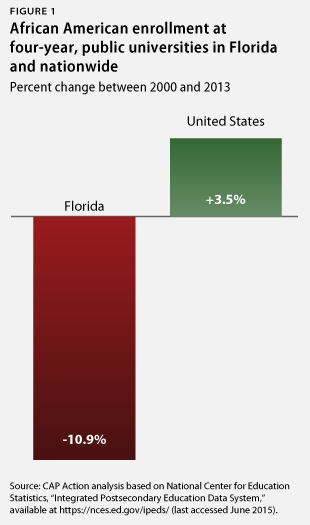 - African American fall enrollment at four-year, public higher education institutions in Florida fell 10.9 percent between 2000 and 2013.