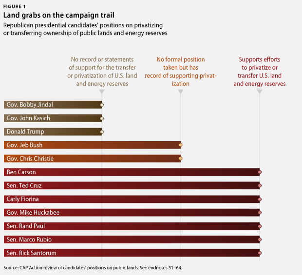Today, the idea that Americans should divest themselves of their national forests, wildlife refuges, and energy reserves is no longer just the pipe dream of anti-government activists and fringe militia groups. It is a rallying cry that candidates for president of the United States are using to cater to deep-pocketed fossil fuel interests, including the Koch brothers, and to energize anti-government activists who now make up a critical component of the Republican base. Several candidates are making these appeals with caution, using dog-whistle language to communicate their support to their target audiences without sounding alarms among mainstream voters.