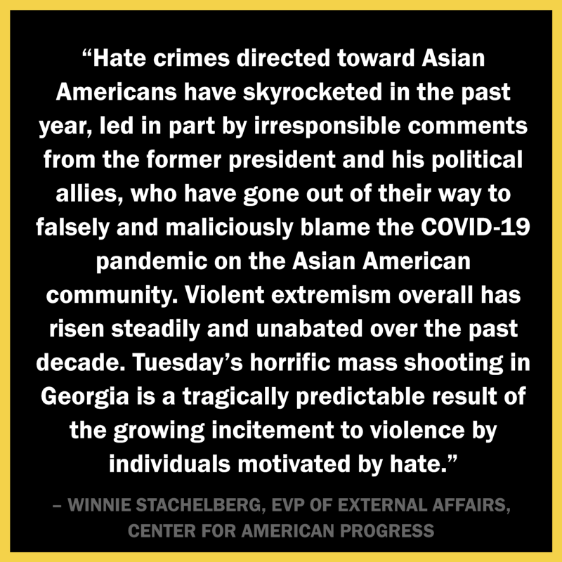 Our hearts are with the families of the victims of Tuesday’s horrific shootings in Atlanta. We must reject and work to end anti-Asian racism in all its forms.