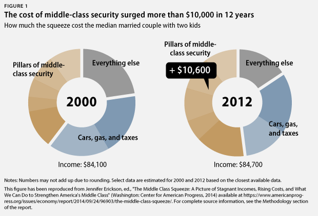 Although corporate profits are at all-time highs and the richest Americans have seen the bulk of the gains in the recovery, working- and middle-class families continue to struggle. The lack of support for families and the challenges of stagnant wages and the ever-rising middle-class costs have placed tremendous strains on most Americans. The research bears out what families are experiencing. The Center for American Progress recently estimated that the real cost of middle-class security—that is to say, health care, college savings, child care, housing, and a retirement nest egg—rose $10,600, or 30 percent, between 2000 and 2012, a period when the median married couple with two children saw no real income growth. (see Figure 1) The result has been that American families are being squeezed more and more as middle-class costs rise faster than middle-class incomes.