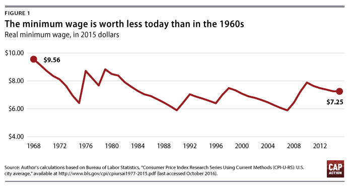 Additionally, the erosion of the real value of the federal minimum wage also hurts earnings. The federal minimum wage was last increased in 2009 to $7.25.18 It has not kept up with inflation and is worth less today than in the 1960s, all while costs for the average working family—such as child care, rent, and higher education—have skyrocketed.19 The current minimum wage is a poverty wage: In fact, a family with one child and a single parent working full-year, full-time for the federal minimum wage would be below the poverty line for a family of two in 2016.20 The declining value of the minimum wage hurts low-income workers, contributing to the fact that earnings for low-income workers have grown much more slowly than wages for those at the top. In fact, inflation-adjusted incomes for the top 1 percent increased by 275 percent from 1979 to 2007, while the bottom 20 percent of households only experienced an 18 percent growth in their real income over the same time period.21