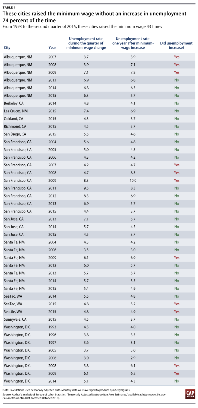 The previous CAP Action analysis examined 25 minimum wage increases in five cities. It found that in 64 percent of the local minimum wage increases from 1993 to 2013, the local unemployment rate did not increase one year after the wage hike.34 This issue brief updates that analysis, looking at the employment effect of minimum wage increases in 13 cities, specifically Albuquerque, Las Cruces, and Santa Fe, New Mexico; Berkeley, Oakland, Richmond, San Diego, San Francisco, San Jose, and Sunnyvale, California; SeaTac and Seattle, Washington; and Washington, D.C. Since more time has elapsed to observe unemployment rates in additional cities, the author was able to observe 43 minimum wage increases from 1993 to the second quarter of 2015.