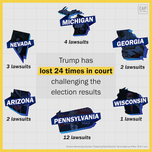 As we’re writing this, 24 of Trump’s attempts to challenge the election results have been rejected by the courts. By the time you read this, that number could very well be higher.