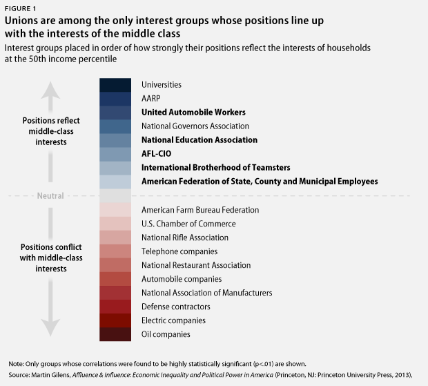 Of the organizations that represent middle-class interests, unions are arguably the most important. While universities and the NGA often advocate for policies aligned with middle-class interests, they generally take positions on a relatively small amount of the policy areas Gilens reviewed. Unions, on the other hand, engage in a large number of issue areas that benefit the middle class, supporting policies such as raising the minimum wage, increasing health care coverage, and promoting retirement security. AARP is another important group, especially when it comes to giving a voice to the needs of older Americans. Unions, however, represent broad swaths of industries and workers and warrant particular attention, as they comprised five of the eight groups Gilens identified with positions that most reflect middle-class interests.