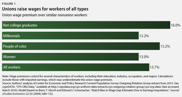 The degree to which unions increase workers’ wages is a heavily studied topic by economists. When unionized workers are compared to their similar nonunionized counterparts, analysis typically shows union wages to be 10 percent to 20 percent higher. The union wage premium is even larger for some demographic groups that, on average, receive lower pay, including workers of color and those without a college education. And these estimates may underestimate the total impact of unions on all workers’ pay due to the union “threat” effect, which occurs when union workplaces put upward pressure on wages at nonunion firms. When unions represent a significant percentage of workers in an industry, nonunion firms often raise their wages to union levels to match the standards in the industry and to discourage their workers from joining a union.