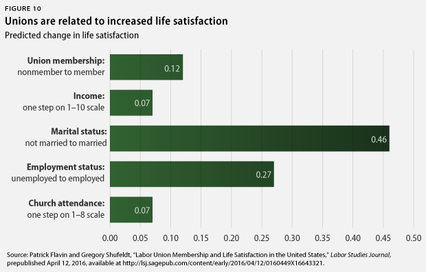 Americans are becoming more and more isolated. Research from Harvard political scientist Robert Putnam has shown that they are less likely to join clubs, socialize with each other, or volunteer than in the past. This declining “social capital” may negatively affect health and life satisfaction. However, unions may help combat these negative effects not only through their ability to improve economic conditions but also through their ability to bring people together in support of common goals. Unions provide a kind of social capital for workers and encourage workers—especially those with lower incomes and less education—to join other organizations, especially political organizations, which can boost their sense of agency. This combination of factors may help explain why unions have a positive impact on workers’ health and general sense of well-being.