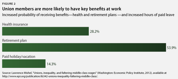 Higher wages are not the only key to a successful middle-class life. Workers also need good benefits, such as retirement plans and high-quality health insurance. And since the number of households with two working parents has risen over the decades, family-friendly workplace policies, such as paid sick leave and family leave, are very important for the middle class. Workers in unions have the power to negotiate for these benefits and ensure they are high quality. Some examples of high-quality benefits include reasonable out-of-pocket expenses for health insurance or having more hours of paid leave. In addition, unions often help workers by making sure workers know how to access these benefits.