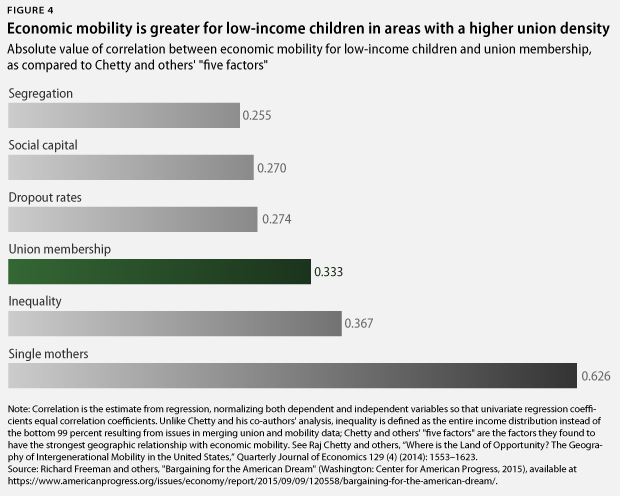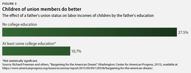 Research by Harvard economist Richard Freeman, Wellesley economist Eunice Han, and David Madland and Brendan V. Duke of the Center for American Progress has shown that being in a union is associated with higher future wages for one’s children—especially for kids whose fathers do not have a college education, further boosting intergenerational mobility. Indeed, American children of non-college-educated fathers earn 28 percent more as adults if their father was in a labor union compared to children in similar families but whose father was not in a union.