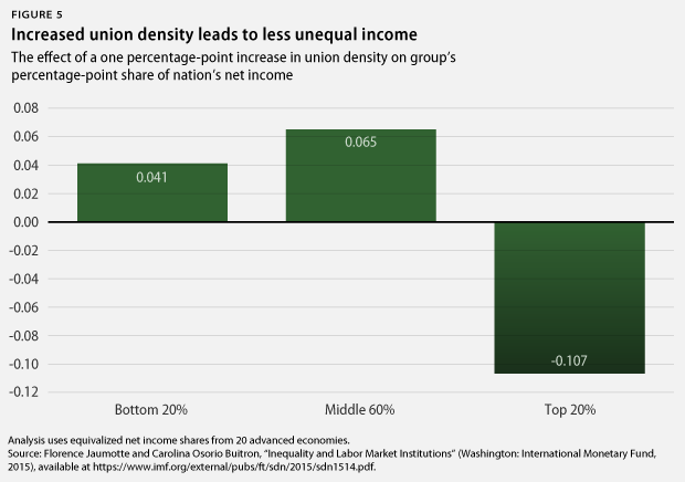 The evidence is clear: When unions are stronger, runaway incomes of the wealthiest are constrained. One study by International Monetary Fund economists found that weaker unions have led to the rich becoming richer across the globe; in fact, a 10 percentage point decrease in a country’s union density was associated with a 5 percent increase in the gross income share going to the richest 10 percent. And multiple studies have found that in companies and industries with stronger unions, CEOs are paid less.