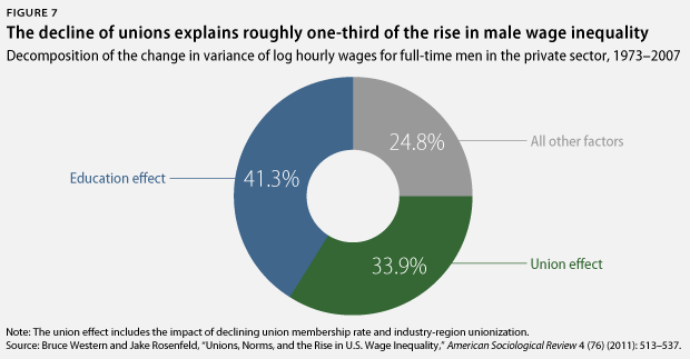 Bruce Western of Harvard University and Jake Rosenfeld of the University of Washington found that the decline of unions from 1973 to 2007 explains up to one-third of rising wage inequality among men and one-fifth among women. Many other studies have similarly reached the conclusion that declining union strength is a key contributor to rising wage inequality.