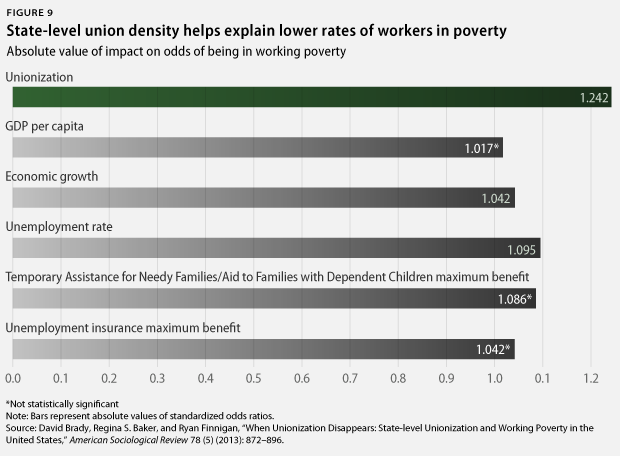 Among the lowest-wage workers, a union contract raises wages by approximately 21 percent. Unions’ effect on fighting poverty is not just limited to union workers, however. In studies of advanced democratic countries around the world, researchers have found that working people in highly unionized areas are less likely to live in poverty. Similarly, a study that compared U.S. states found that state-level unionization measures actually had a larger impact on working poverty rates than gross domestic product, or GDP, per capita and economic growth rates. The union effect remained after controlling for households’ union status and even dropping union households from the sample entirely, showing that unions do not just affect workers by facilitating higher-paying union contracts but also through raising nonunion wages and by taking political action.