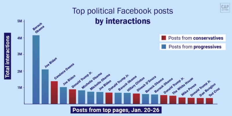 Let’s compare this data to the week prior: Progressives account for 7 of the top 10 posts compared with 4 of the top 10 during the previous week. The number of interactions on those posts nearly doubled, too — more than 13 million interactions compared to about 6 million.