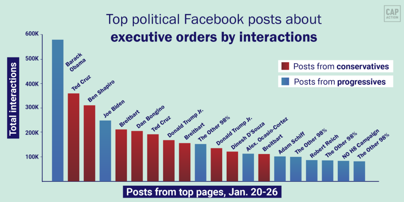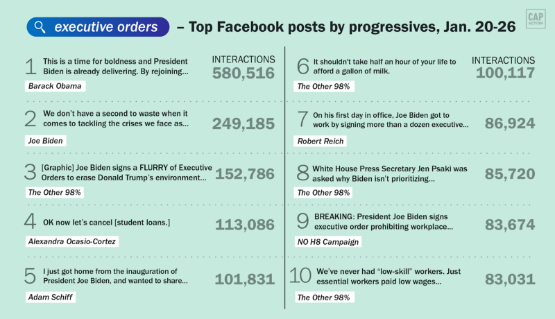 Top ten Facebook posts from progressive pages about executive orders over the last week, according to data from NewsWhip.