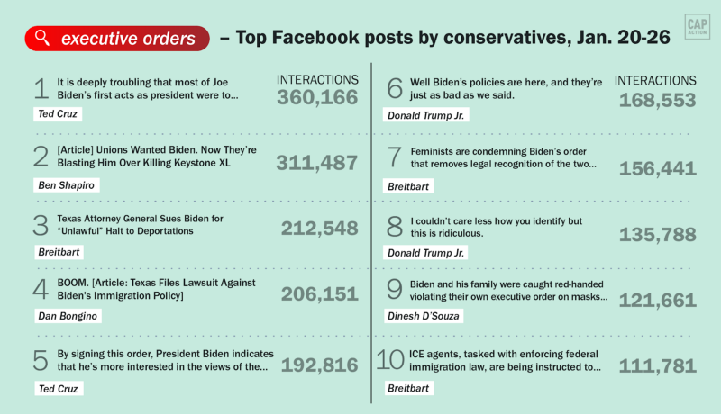 Top ten Facebook posts from conservative pages about executive orders over the last week, according to data from NewsWhip.