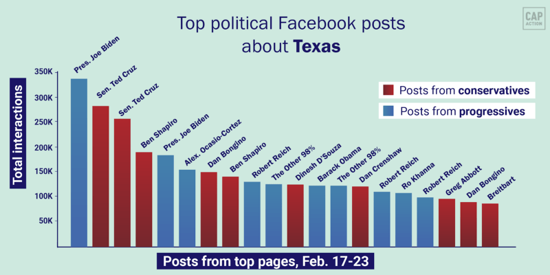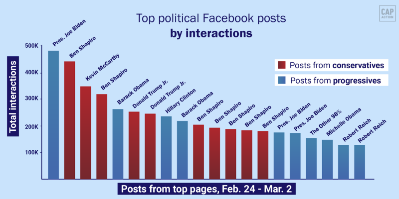 Conservatives continued to outperform progressives in top posts this week, publishing 6 of the top 10 political Facebook posts by interactions.
