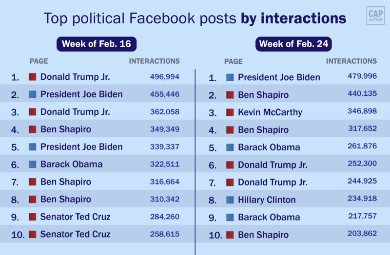 Top 10 best-performing political Facebook posts on the left and right for the weeks of February 16 and February 24 by interactions according to data from NewsWhip.
