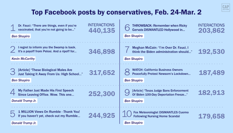 CPAC: Top posts from conservative Facebook pages covered a myriad of topics last week. Some shared videos from CPAC, and there was a disturbing rise in transphobic and anti-immigrant content in response to congressional hearings and executive orders. Progressive pages also featured a range of content including evergreen photo posts, President Obama’s new podcast with Bruce Springsteen, and news of the day. A cute photo of Champ and Major Biden took the overall top spot, followed by a Ben Shapiro video denouncing Dr. Fauci.