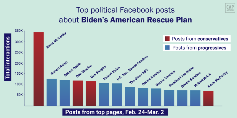 Up until this point, conservatives have been doing everything they can to avoid mentioning the ARP on Facebook. But with this new “Pelosi Payoff” framing from McCarthy (and its virality), I think that’s likely to change. So it is imperative that progressives get serious about amplifying a consistent message around the bill, illustrating the tangible ways it will help Americans with direct economic aid, reopening schools, increasing vaccinations, and ending the pandemic.
