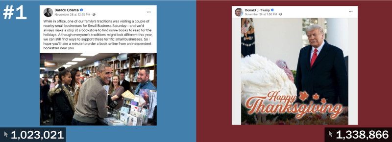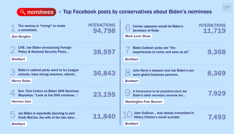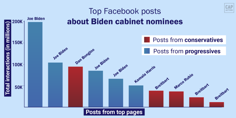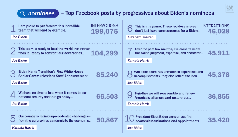 And while top political posts on Facebook over the past week were largely focused on the Thanksgiving holiday, there was a noticeable shift from progressives toward amplifying these announcements and nominations.