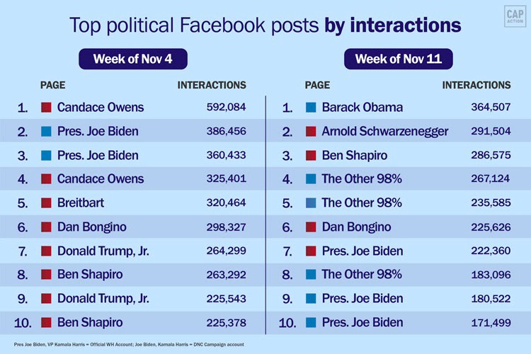 This image features a bar chart comprised of the top political Facebook posts from November 11th to November 17th. It is organized by interactions by the hundred thousand. There is a color distinction between conservative and progressive posts. In order of the most interactions to the least, it goes Obama, Arnold Schwarzenegger, Ben Shapiro, the other 98%, The Other 98%, Dan Bongino, President Biden, The Other 98%, Biden, Biden, Breitbart, Breitbart, NRA, Bongino, Breitbart, Candance Owens,