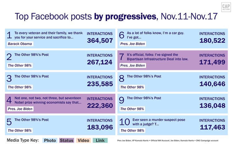 After several weeks of conservatives outperforming progressives in our ranking, progressives took six of the top 10 posts of the past week on Facebook. Led by a Veterans’ Day photo post by President Obama, other top performers included two memes about Kyle Rittenhouse’s trial and a statement post by President Biden about support for his Build Back Better Act.