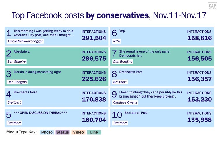 Top posts from conservatives include a photo carousel celebrating Veterans’ Day from Arnold Schwarzenegger, a link post about Kyle Rittenhouse’s trial from Ben Shapiro, and a link post from Dan Bongino about Florida ports.